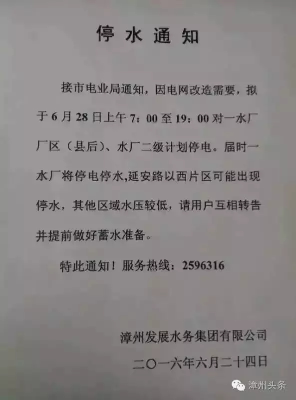 根據(jù)漳州市電業(yè)局通知,因電網(wǎng)改造需要,6月28日上午7:00至19:00,將對(duì)漳州一水廠廠區(qū)(縣后)、水廠二級(jí)計(jì)劃停電。屆時(shí),一水廠將停電停水,延安路以西片區(qū)可能出現(xiàn)停水,其他區(qū)域水壓較低,請用戶互相轉(zhuǎn)告并提前做好蓄水準(zhǔn)備。