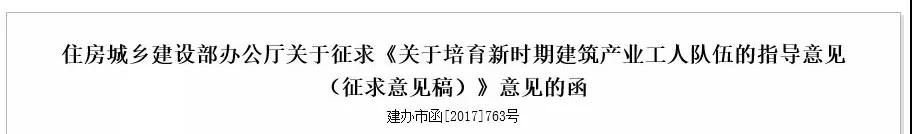 2017年11月,住建部印發(fā)關于《關于培育新時期建筑產(chǎn)業(yè)工人隊伍的指導意見(征求意見稿)》(建辦市函[2017]763號)。